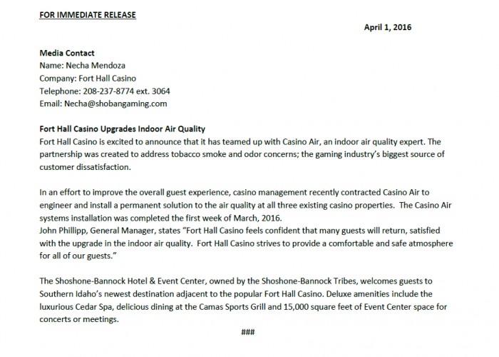 Casino Air recently signed a contract with the Shoshone-Bannock Tribe to remediate the tobacco smoke and odor in their three existing casino properties. Work should be completed the first week of March, 2016. Clean air is good business.